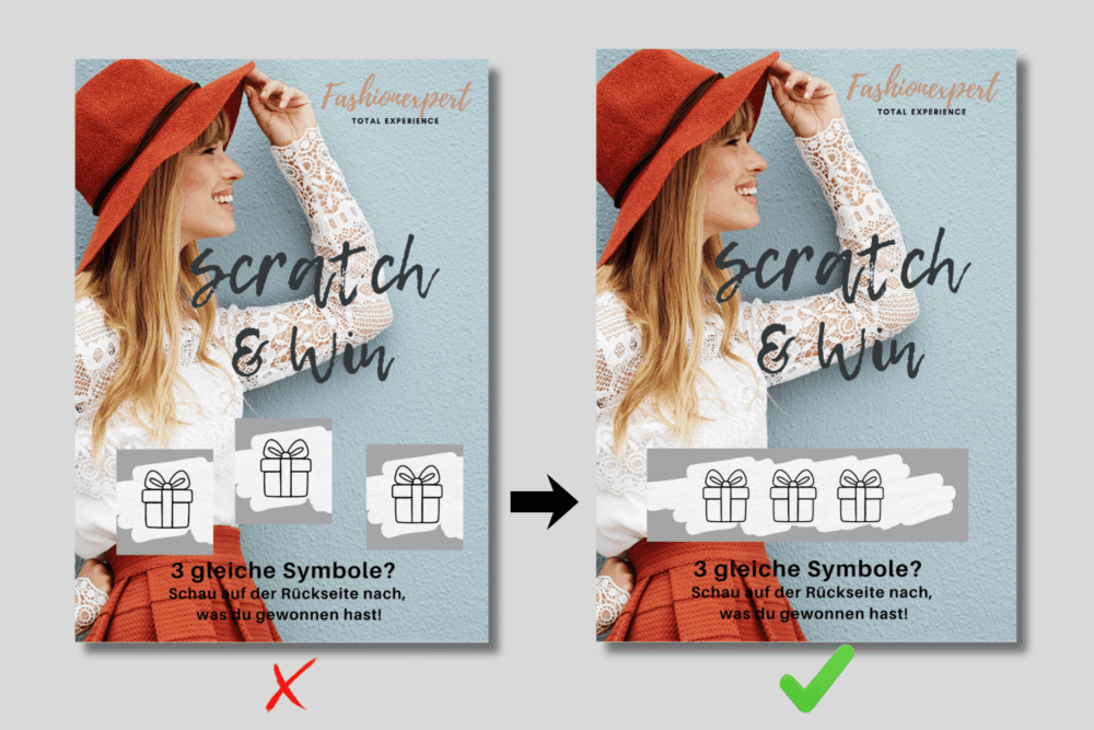 Möchten Sie auf Ihrer Rubbelkarte zum Beispiel 3 Symbole darstellen, um einen Gewinn- oder Spielmoment zu visualisieren?